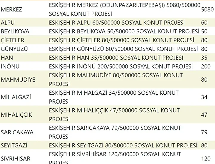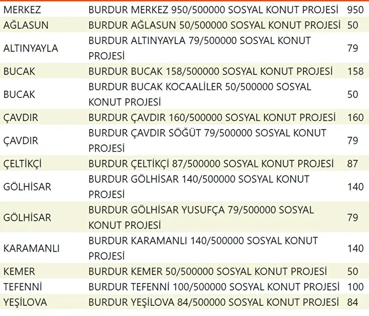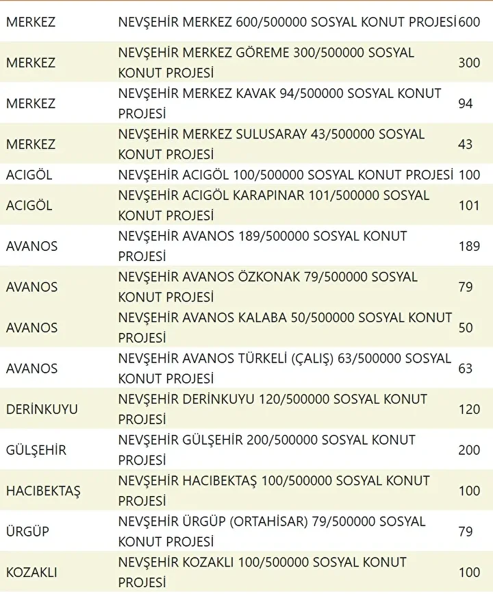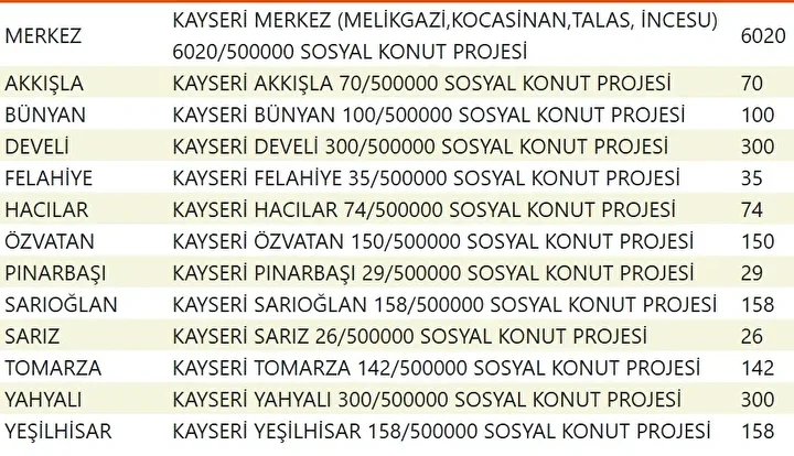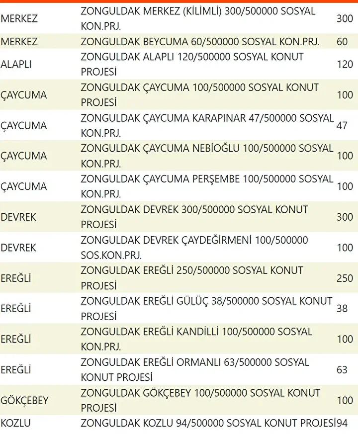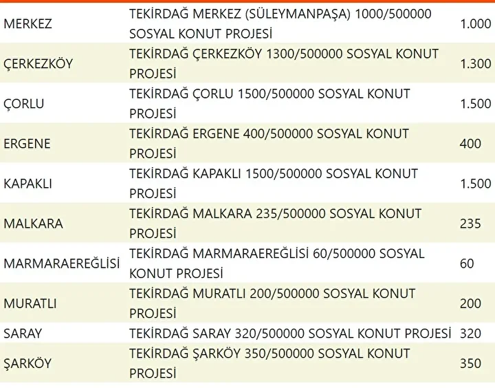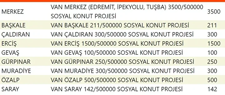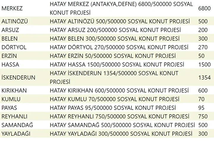 Projede en fazla konutun yapılacağı iller İstanbul, Ankara, İzmir, Bursa ve Konya olarak kayıtlara geçti. Bu doğrultuda 81 ilde 500 bin konutun yükseleceği ilçeler de netleşti.