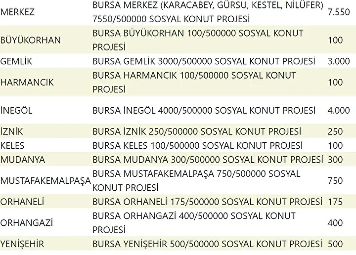 Bursa’da 17 bin 225 konut, Karacabey, Gürsu, Kestel, Nilüfer, Büyükorhan, Gemlik, Harmancık, İnegöl, İznik, Keles, Mudanya, Mustafakemalpaşa, Orhaneli, Orhangazi ve Yenişehir ilçelerinde yer alacak.