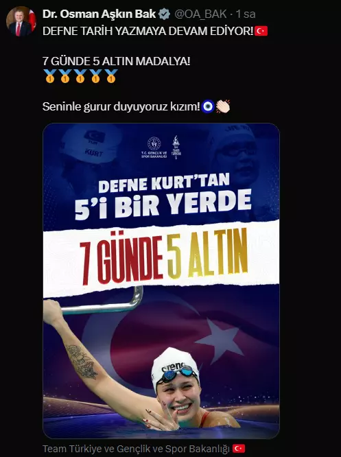Öte yandan Gençlik ve Spor Bakan Osman Aşkın Bak, sosyal medyada yaptığı paylaşımla milli para yüzücü Defne Kurt’u başarısından dolayı tebrik etti. Bakan Bak, “Defne tarih yazmaya devam ediyor. 7 günde 5 altın madalya. Seninle gurur duyuyoruz kızım” ifadelerinde bulundu.
